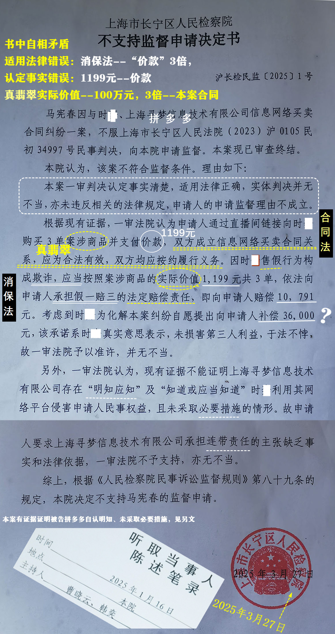 一、《决定书》整体上违反《人民检察院民事诉讼监督规则》、《最高人民检察院关于实行检察官以案释法制度的规定》等法律法规 1. 《决定书》违反《监督规则》第四十八条,没有依法全面、客观、公正地叙述案件事实,敷衍了事。 《决定书》正文只有一页另四行,527字。 《监督申请书》提出法院审理案件存在问题61个,A4纸146页,文字8万余(罄竹难书)。最后就换来检察院“一张纸”,申请人能服气吗?好歹一审《判决书》还有25页呢。检察官涉嫌渎职。 2. 检察官违反《监督规则》第四十三条 人民检察院审查民事诉讼监督案件,应当围绕申请人的申请监督请求、争议焦点……对人民法院民事诉讼活动是否合法进行全面审查。…… 《决定书》没有依照《监督规则》针对申请人《监督申请书》提出的法院诉讼活动存在的61个焦点问题(一审49个、再审12个)做出任何回应,合理怀疑检察官没有审查,更别说全面审查。检察官涉嫌渎职。 3. 检察官违反《以案释法制度的规定》第十条 检察官应当围绕检察法律文书内容及检察机关办案过程中涉及的重点问题,或者释法对象要求说明的重点问题进行释法说理,具体包括:(一)认定的案件事实、(二)适用的法律条文、(五)释法对象提出的其他相关问题。 (1)《决定书》:本院认为,该案不符合监督条件。理由如下:本案一审判决认定事实清楚,适用法律正确,实体判决并无不当,亦未违反相关的法律规定,申请人的申请监督理由不成立。 理由所用套话一串,无释法、说理,涉嫌渎职。 (2)真相刚好相反 ★本案一审有认定事实不清:①一审认定的“全过程”没有证据支持——有“断片”,不是“全过程”。《光盘》(被法官隐瞒)能补齐 “断片”并推翻《判决书》结论。②被告“百万级别”的意思是一百万元,法官不认,《光盘》能打其脸。③案涉商品的实际价值是100万元___法官的几次反言。④证据证明案涉商品含平台禁售商品,一审不予认定。⑤被告2拼多多已经自认“明知”,但一审法官仍歪曲事实袒护。 ★本案一审证据也有很多问题:①法官隐瞒依法调取的核心证据《光盘》。②采信非法证据____拼多多提供的六组证据无一组合法(无签名、无印章,《民诉法解释》第115条)。③法官伪造非证据为证据__《…处罚截图》。④邓X法官故意毁弃案件材料,被告拼多多代理人无合法身份但参与庭审。⑤《判决书》引用未质证但入卷证据。⑥一审遗漏原告证据视频两项。 ★本案一审有适用法律错误:①类案识别中法官的违法判断:《判决书》第19页,法官用“两案案情并非完全一致”否认例案是类案,违反法律“相似性”标准,滥用自由裁量权。②连带责任判决中法官的偷换概念:《判决书》第20页,法官把“处罚措施”当成“必要措施”偷换概念、枉法裁判。③连带责任判决中无法律依据的“合理期限”。④连带责任的其它法律条款:主体登记、行政监管与连带责任判断有关。⑤判决用“实际价值”代替“价款”(本例后面讨论)。⑥关于诉讼请求3损失扩大部分,法官的违法判断与计算。可得利益损失赔偿有法律依据,不以任何“人”为标准,一审法官滥用自由裁量权,适用法律错误。⑦法官违法直接用法律原则判案。《判决书》第19页,“最后,原告主张高额赔偿的行为有违诚实信用及善良履约原则。因此,本院对该等诉请均不予支持。”原告每项诉请均依法有据。 ★ 本案实体判决有错误:①《判决书》说的是合同法商品“实际价值”,用的却是消保法“价款”数字。②遗漏诉请1,赔偿标的物的实际价值。③遗漏诉请3,赔偿增值利益。④拼多多连带责任成立,不是不成立。 二、《陈述笔录》中的特殊问题 1. “断片”4分钟——检察官不给看的重要事实。【长宁检察院】2025-01-16长宁检察院听取当事人陈述现场。 (1)《当事人陈述笔录》第3页,申请人开门见山重点强调了“购买过程提供的三份证据不完整,缺了4分钟,有断片”。…… 一审认定的“全过程”没有证据支持。“断片”补齐后能够直接否定《判决书》结论。“断片”曾书面申请法院调取,但没有得到。事实是拼多多已经提供:“原告申请调取的下单当天的视频已刻盘”。原告没有见到该“光盘”,怀疑一审法官隐瞒。 (2)检察官说已调取档案,含光盘,但不能给你看。||| 可调取谈话监控。拿出来看看,一切都解决了,为何不敢给?该《光盘》能够直接否定《判决书》结论。 2. 检察官说调阅一审卷宗有代理人身份证据,但又不给申请人看。其实,即便卷宗有,又能怎样?庭审无原件,非法参与庭审已成既定事实。再审卷宗暴露出代理人身份造假:代理人以员工身份参与诉讼,但其提供的劳动合同并无签字、盖章和日期,属于无效合同;代理人授权委托书是伪造的:印章没有“骑年盖月”,提前盖好公章的空文书,后填写日期。再审身份造假与一审代理人身份资料被法官隐匿互相印证。 3. 关于本案“类案”检察院的态度粗暴无理。 《陈述笔录》第6-7页,当事人说到类案时,检察官一口否决,“我们国家不是案例法。”说明检察官拒绝类案同判,与《最高人民法院关于统一法律适用加强类案检索的指导意见》相悖,也和总书记提倡的“在每一个司法案例中,让老百姓感受到公平和正义”的理念相违背。 三、《决定书》具体错误 1. “假一赔三”适用法律错误——从《决定书》可以直接看出其自